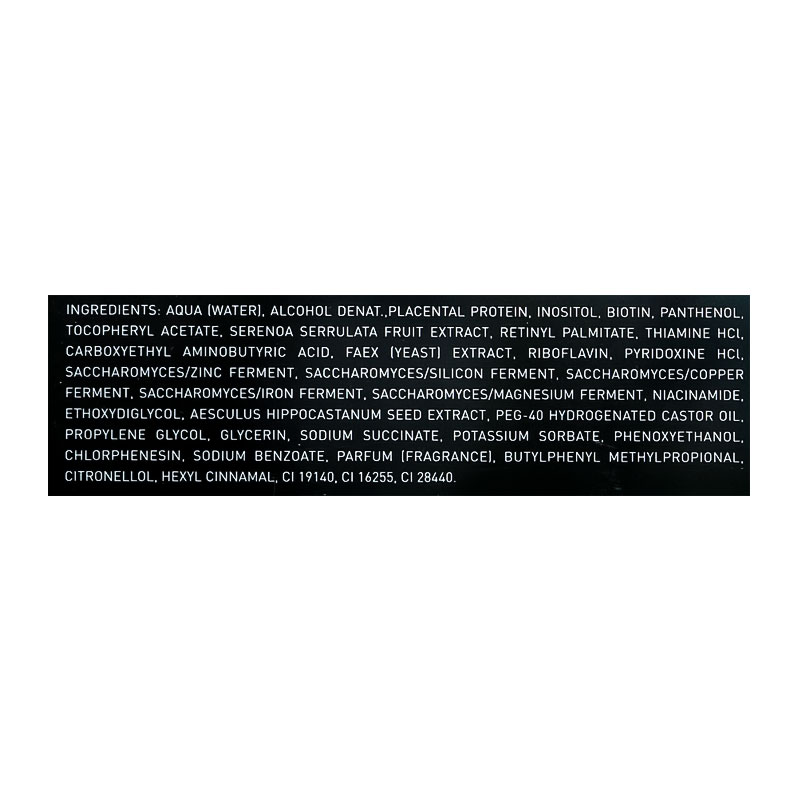 В составе также присутствует плацентарный экстракт, стимулирующий рост волос и комплекс витаминов, протеинов и ферментированных микроэлементов (магний, железо, цинк, медь, кремний), глубоко питающих кожу головы и поддерживающих здоровое состояние волосяных фолликулов.
