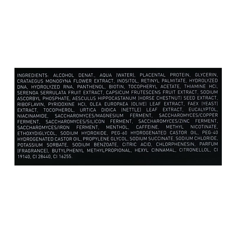 В состав лосьона входит сочетание пуриновых и пиримидиновых оснований, аденозина, плацентарного экстракта, кофеина, кайенского перца, микроэлементов (железо, цинк, кремний, магний), витаминов и серосодержащих аминокислот. Активная формула обогащена экстрактом карликовой пальмы, блокирующим действие гормона, провоцирующим потерю волос.