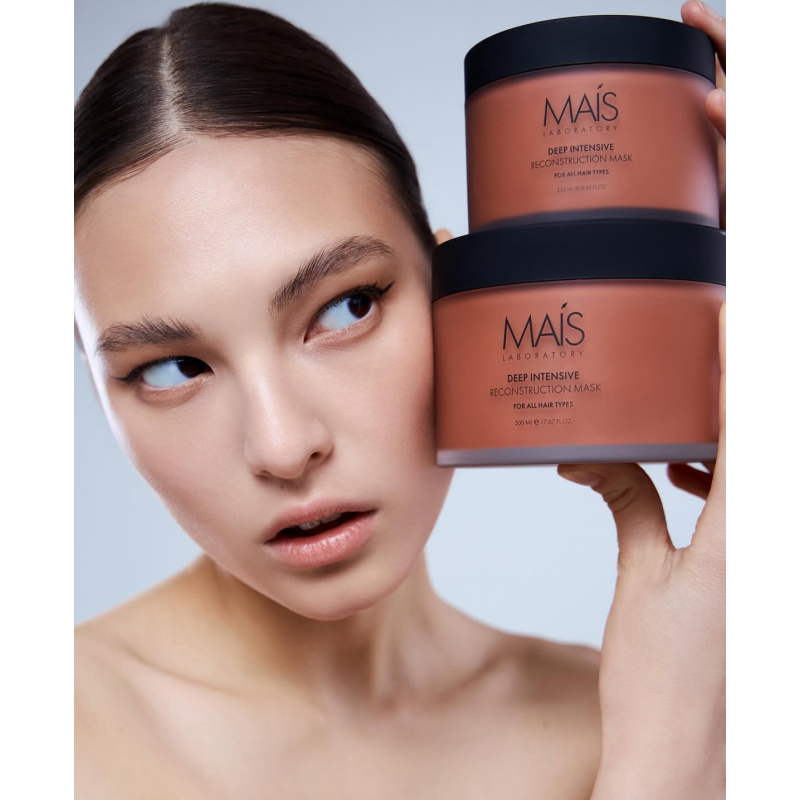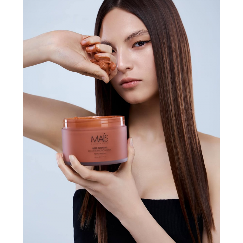 Mais Deep Intensive Reconstruction Mask — високоефективна маска для глибокого відновлення та реконструкції сильно пошкодженого, сухого й ослабленого волосся; працює на клітинному рівні, проникаючи в структуру для ремонту пошкоджених ділянок, підходить для фарбованого та після хімічних процедур, забезпечує інтенсивне живлення й зміцнення без обтяження.