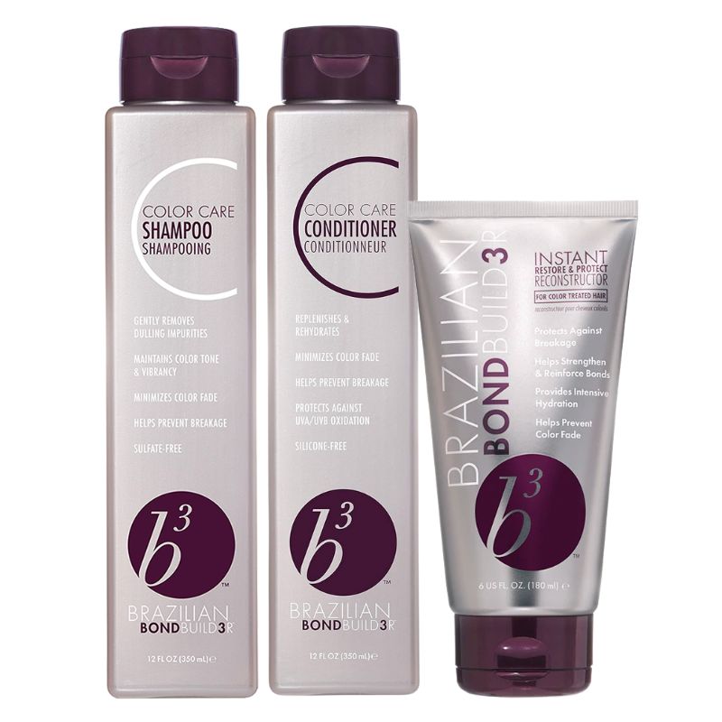 Набор Brazilian Blowout B3 Color Care предназначен для комплексного ухода за окрашенными, осветленными или мелированными волосами, обеспечивая деликатное очищение, глубокое увлажнение, восстановление структуры и фиксацию пигмента без вымывания цвета; шампунь мягко очищает и укрепляет, кондиционер питает и защищает, маска-реконструктор усиливает регенерацию и предотвращает ломкость, подходит для всех типов окрашенных волос, включая сухие и ослабленные после химических процедур, продлевает стойкость оттенка и минимизирует повреждения без сульфатов, силиконов и парабенов.