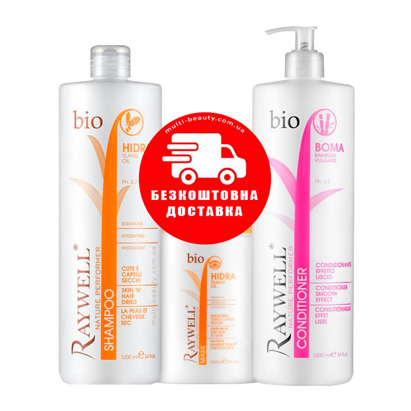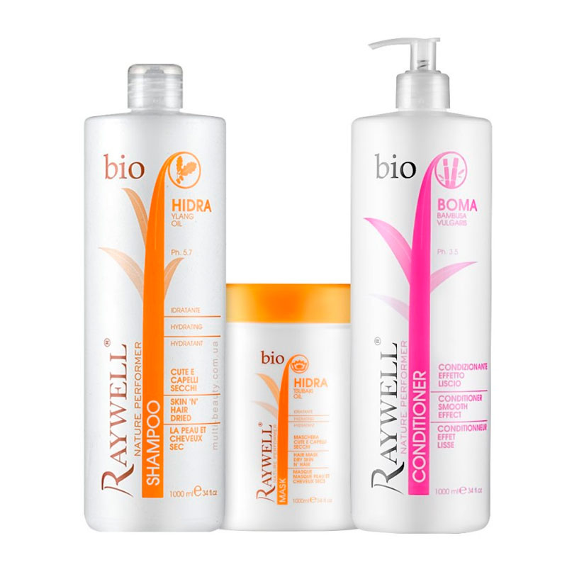 Набор для увлажнения и блеска сухих поврежденных волос Raywell Bio шампунь и маска Hidra и кондиционер Boma с эффектом разглаживания 3x500 г (разлив)