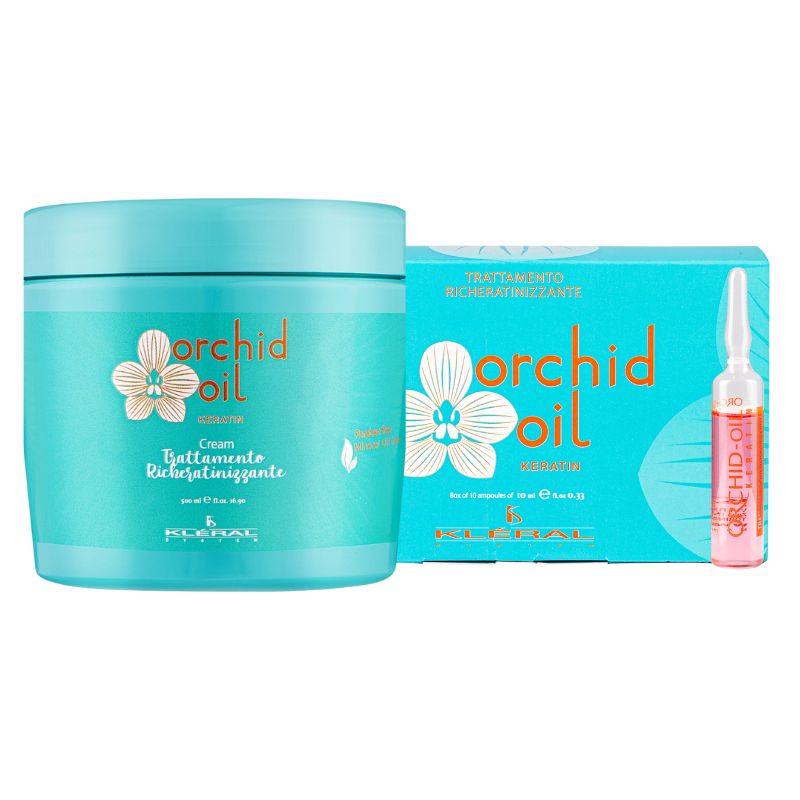 Набор KLERAL System DUO Orchid предназначен для интенсивного восстановления сухих, ослабленных и поврежденных волос; маска глубоко увлажняет и питает структуру, восполняя кератин, ампулы насыщают прокератином и экстрактом орхидеи для регенерации чешуек, подходит для всех типов, включая пористые и после химических процедур, обеспечивает блеск и эластичность без парабенов и сульфатов.