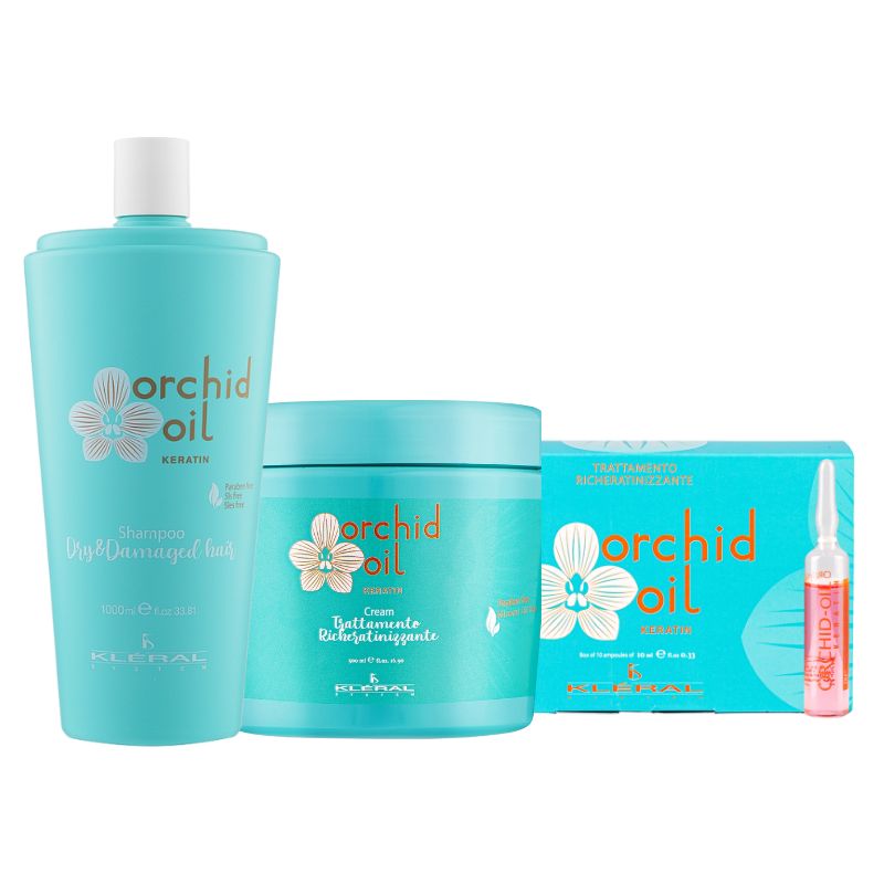 Набор KLERAL System Orchid Oil TRIO предназначен для комплексного ухода за сухими, ослабленными и поврежденными волосами; шампунь мягко очищает без сульфатов, насыщаен маслом орхидеи и кератином, маска глубоко увлажняет и реструктуризирует структуру, ампулы обеспечивают интенсивное питание прокератином для восстановления чешуек, подходит для всех типов, включая окрашенные и после процедур, обеспечивает блеск и эластичность без парабенов, SLS и SLES.