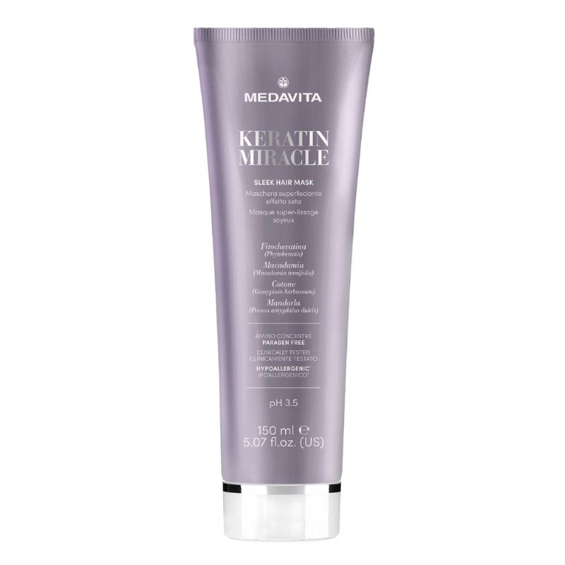 Medavita Keratin Miracle Sleek Hair Mask — разглаживающая маска с эффектом шелка для непослушных, пушистых и вьющихся волос; с pH 3.5 обеспечивает глубокое проникновение в структуру для интенсивного восстановления и увлажнения, подходит для всех типов, включая ослабленные после химических процедур, создает защитный барьер от сухости и влажности, минимизирует пушистость без парабенов.