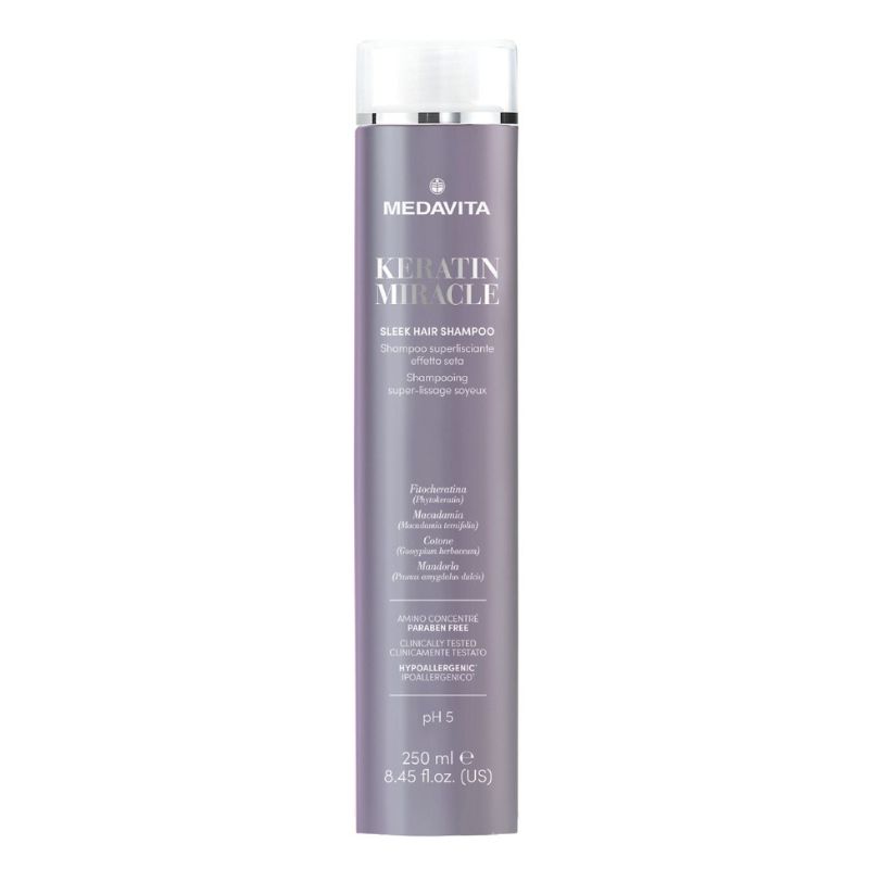 Medavita Keratin Miracle Sleek Shampoo — разглаживающий шампунь с эффектом шелка для непослушных, пушистых и вьющихся волос; обеспечивает деликатное очищение с pH 5, проникая в структуру для восстановления и заполнения повреждений, подходит для всех типов, включая ослабленные после химических процедур, минимизирует пушистость, придает блеск и эластичность без парабенов и сульфатов.