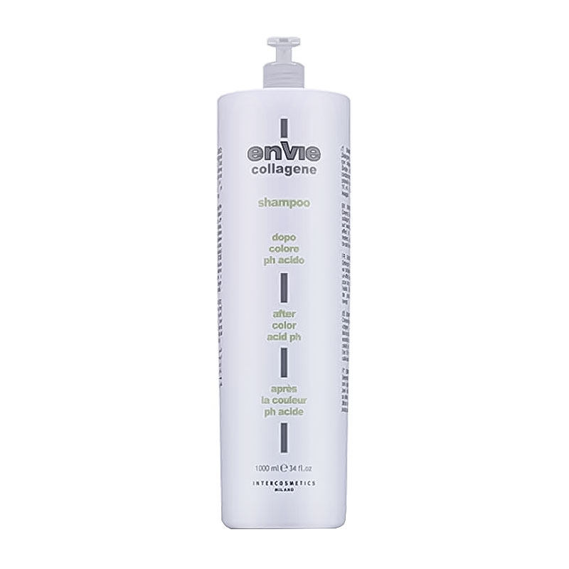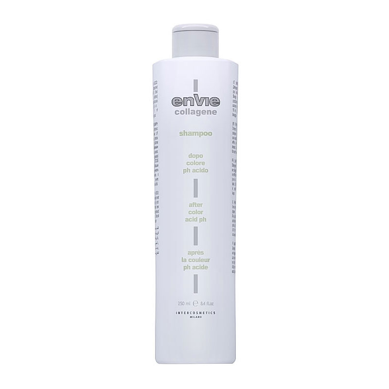 Шампунь Collagene After Color Shampoo от Envie (страна-производитель – Италия) с коллагеном и кислым рН разработан для окрашенных и поврежденных химической обработкой локонов. Белок коллагена в составе притягивает и удерживает влагу внутри структуры волоса, образуя защитную пленку, которая кондиционирует, придает объем, глянцевый блеск и упругость локонам.
